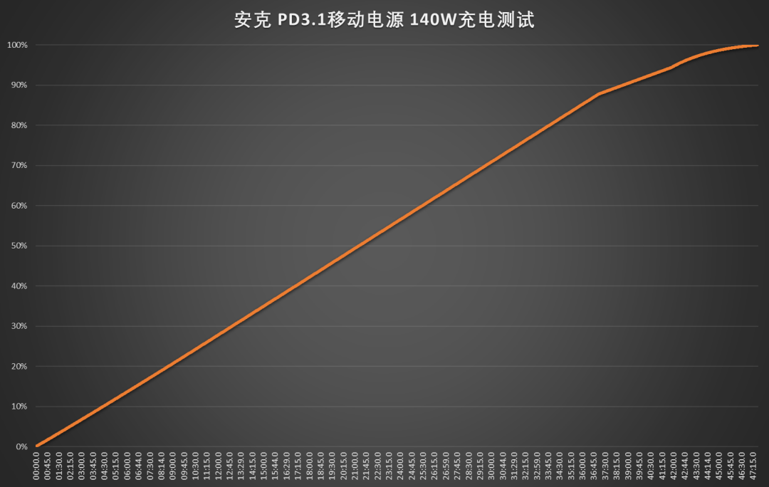 通過上圖的充放電曲線可以看到,安克 USB PD 3.1 移動(dòng)電源 140W 充電全程不到50分鐘,接入 140W 負(fù)載后放電約33分鐘。在如此大的充、放電功率下,移動(dòng)電源電量曲線變化十分線性、平滑,沒有出現(xiàn)跳變、忽快忽慢等情況,電量顯示十分精準(zhǔn)。