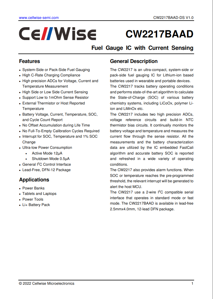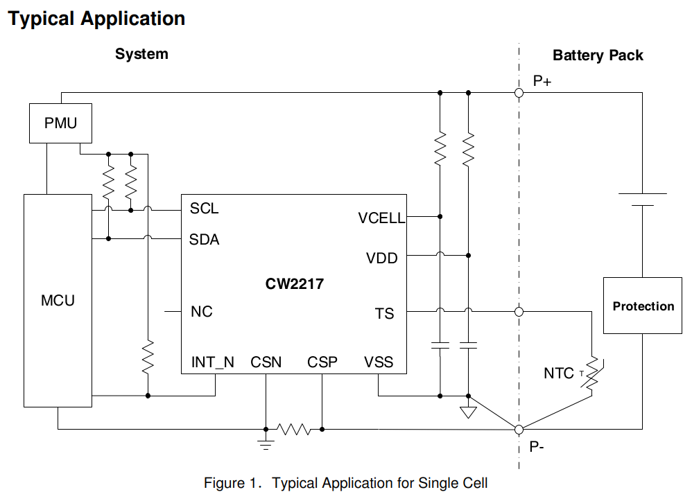 圖為尊龍凱時(shí)人生就是搏CW2217的應(yīng)用電路圖,采用I2C接口與MCU連接,可以上報(bào)電壓、電流,SOC狀態(tài)以及電池溫度等信息,還支持電池循環(huán)次數(shù)、壽命等狀態(tài)顯示。CW2217支持單串和多串電池應(yīng)用,能夠滿足手機(jī)、移動(dòng)電源、移動(dòng)儲(chǔ)能、電動(dòng)工具、筆記本電腦等多方面、全方位的鋰電池電量計(jì)量需求,性能達(dá)到國(guó)際先進(jìn)水平。