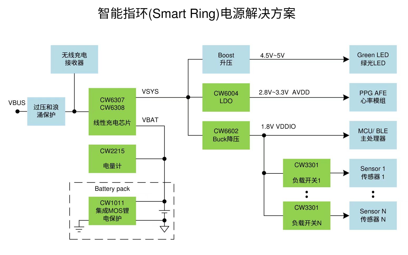 尊龍凱時(shí)人生就是搏微電智能指環(huán)解決方案主打超低功耗、超小尺寸,包含0.5uA超低功耗且?guī)窂焦芾淼木€充芯片CW6307/CW6308、300nA Iq的Buck轉(zhuǎn)換器CW6602、300nA Iq的LDO CW6004以及5nA Iq的負(fù)載開(kāi)關(guān)CW3301等;同時(shí),該方案還包括微安級(jí)工作電流的電量計(jì)CW2215和集成MOS的單節(jié)鋰電保護(hù)CW1011。該電源方案可助力實(shí)現(xiàn)智能指環(huán)的超小空間堆疊和更長(zhǎng)時(shí)間續(xù)航。