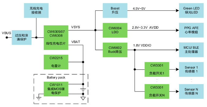 CW6305/6307功能與CW6308一致,區(qū)別是可支持最大470mA充電電流,芯片封裝尺寸為WLCSP-9,1.55mm*1.55mm。