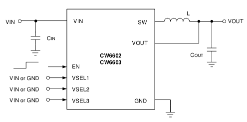 CW6603的功能和尺寸與CW6602一致,區(qū)別是輸出電壓范圍為0.6V~1.2V。