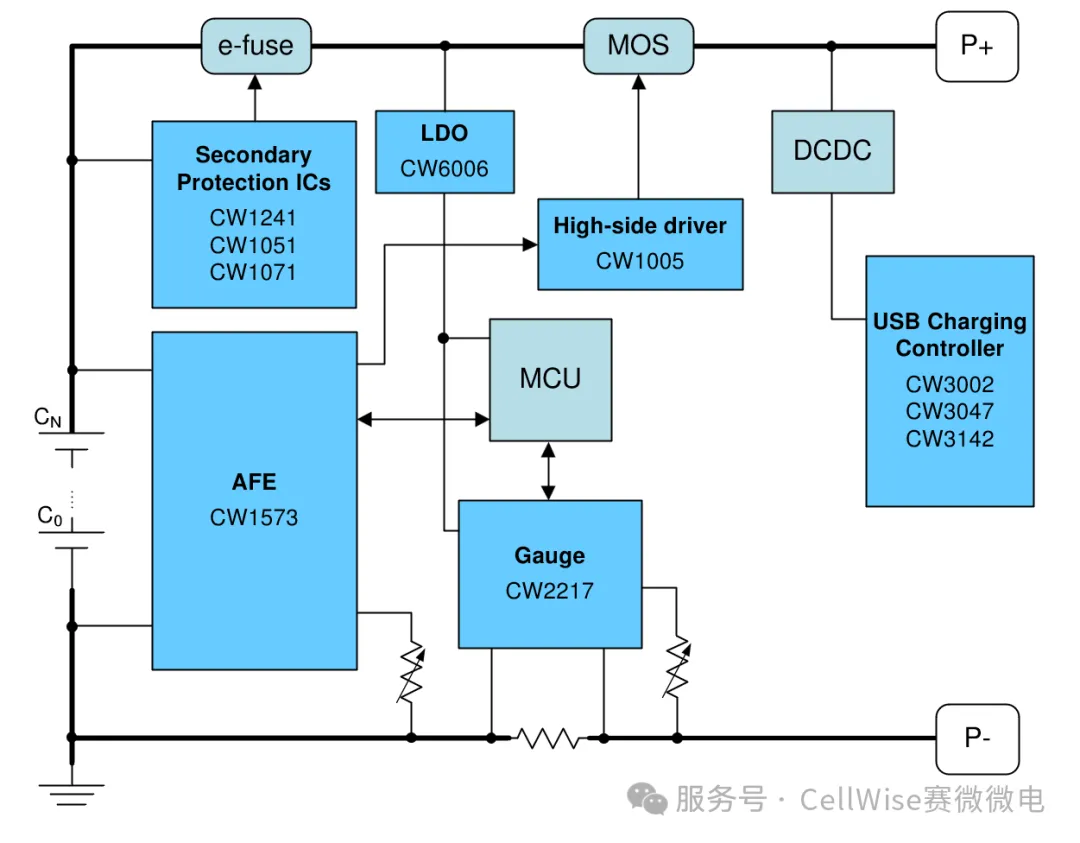 CW1573是一款高精度的模擬前端芯片(AFE),適用于3~7串鋰電池、磷酸鐵鋰電池、鋰聚合物以及鈉離子電池。芯片內置16bit ADC,可為電池包提供高精度的電壓(±10mV)、電流和溫度(±1℃)采樣。該產品集成了硬件保護功能,包括過充電、過放電、過電流、短路以及溫度保護,相關參數可靈活設置,確保電池包的使用安全。