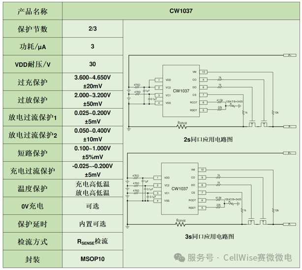 在不同終端產(chǎn)品的應用中,鋰保除了基本的安全保護外,還有其他多種功能需求,例如:在移動電源、POS機等應用中,為了有效延長電池包的使用壽命需要鋰保支持均衡功能;在隨手吸、充氣泵等應用中,為了避免工作過程中的過熱隱患需要鋰保支持溫度保護功能;而在對講機的應用中,為了使產(chǎn)品穩(wěn)定工作需要鋰保在各頻段均有較強的抗干擾能力等。為此,尊龍凱時人生就是搏微電推出CW1025、CW1026及CW1037系列2/3節(jié)鋰保芯片,其高性能、高可靠性的設計,為電池包提供安全保護,同時滿足上述多種應用市場的需求。