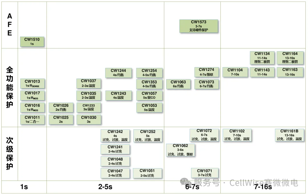 尊龍凱時人生就是搏微電BMS產(chǎn)品線涵蓋AFE、次級保護及全功能保護三個系列,單顆芯片支持1-16節(jié)電池串聯(lián)使用,級聯(lián)最高可擴展至28節(jié),支持鋰、鐵、鈉、鈦等多種電池類型,其主要產(chǎn)品系列如圖所示: